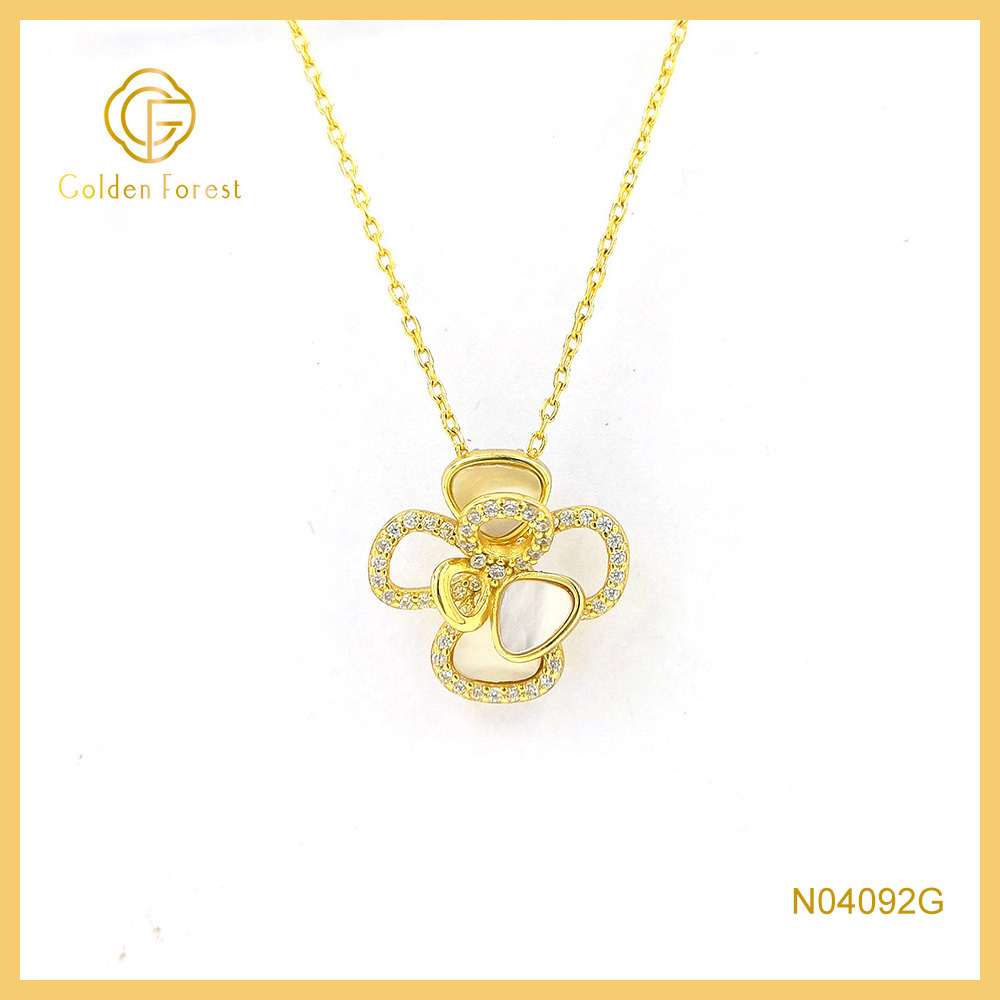 925 Silver MOP Sculpture Flower Pendant Necklace wiht Gold Plated & CZ