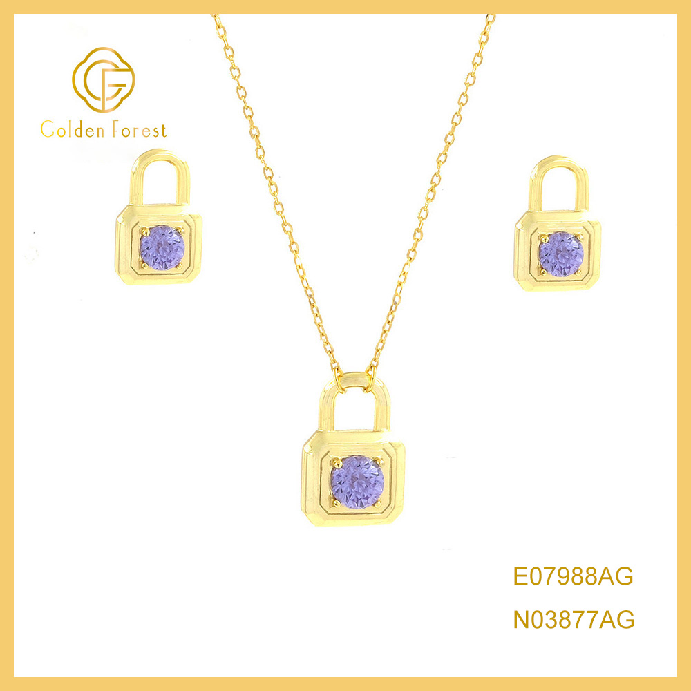 Gold Plated Multicolor CZ Lock Stud Necklace jewelry Set for Valentine