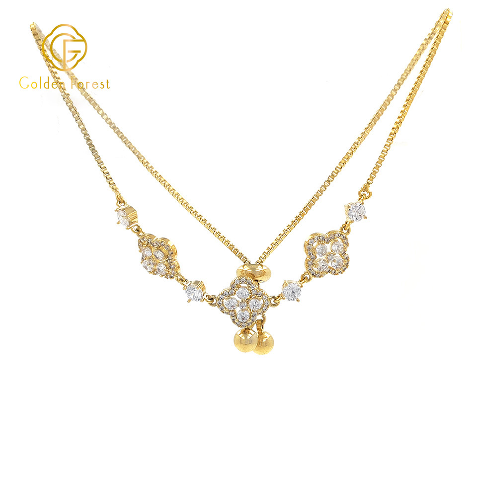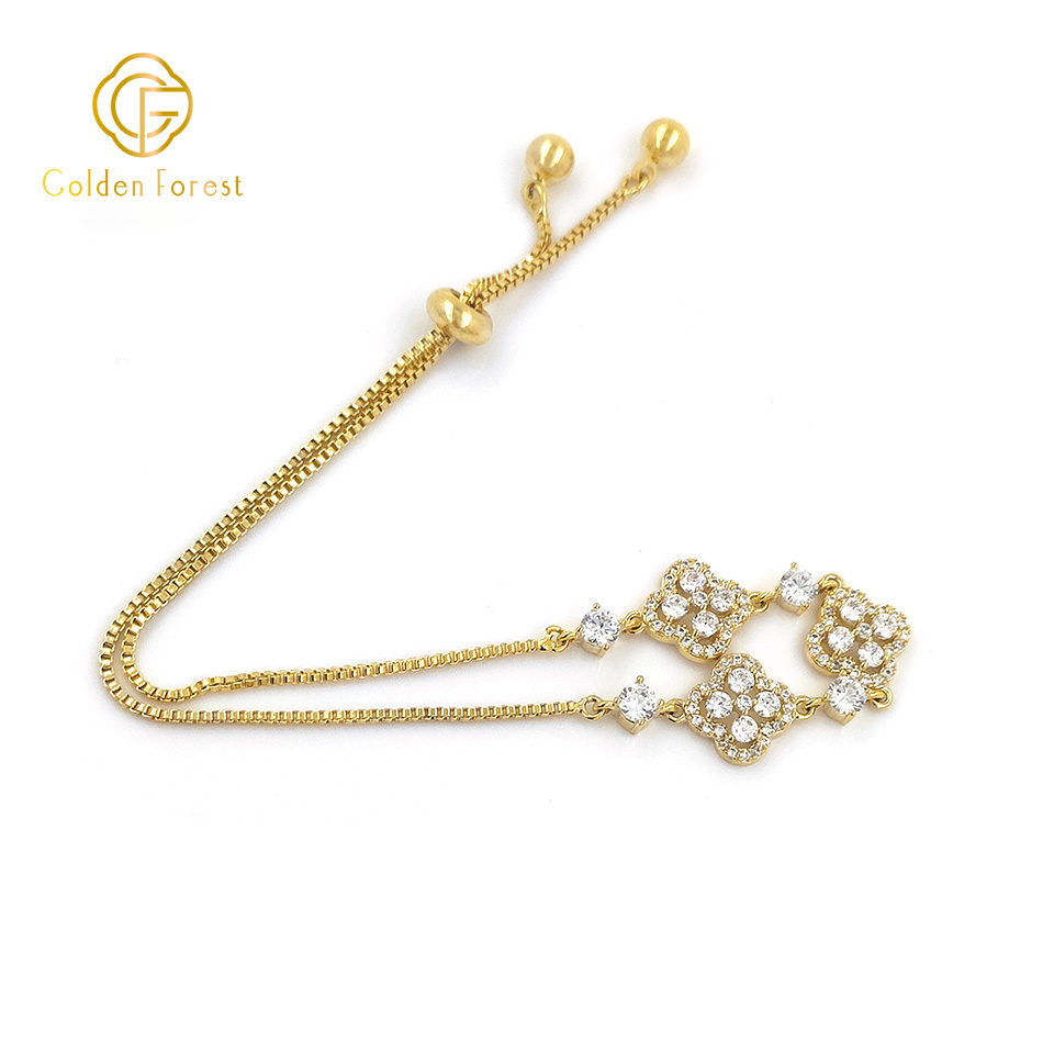 It showcases three clover – shaped motifs, each encrusted with sparkling diamond – like stones, interspersed with smaller round gems.
