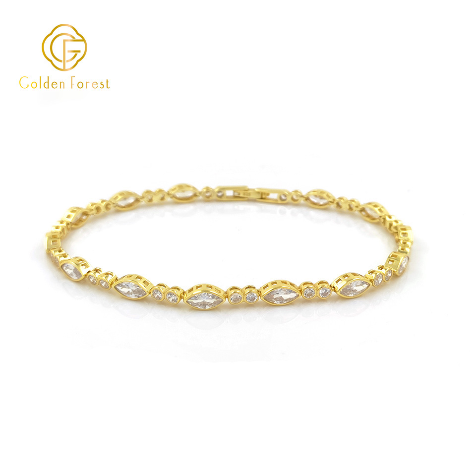 This gold – plated bracelet features a unique geometric – inspired design, with small, shimmering stones intricately inlaid along the chain.