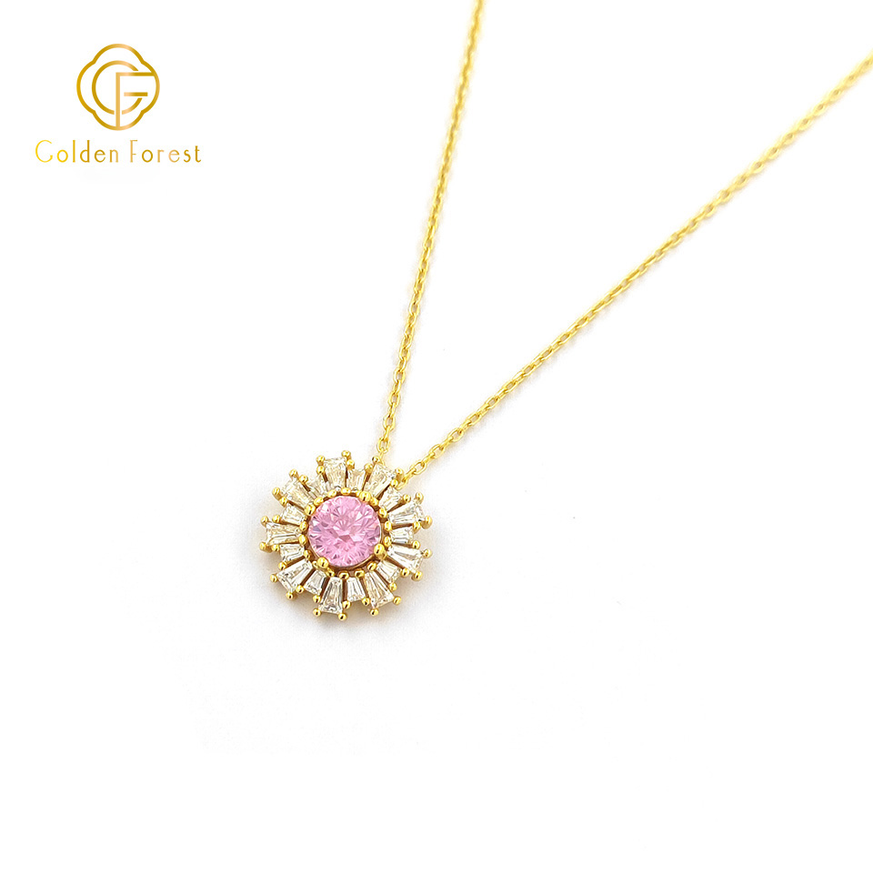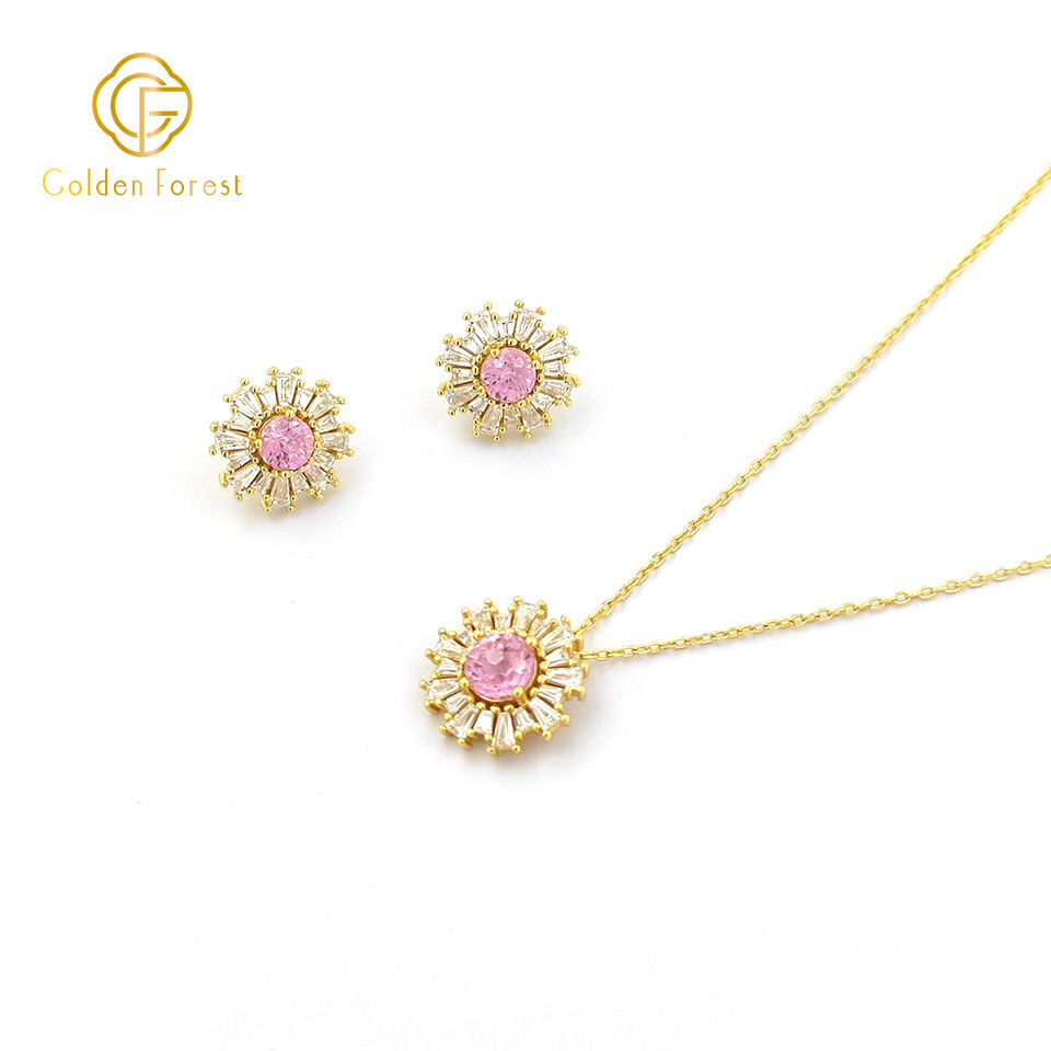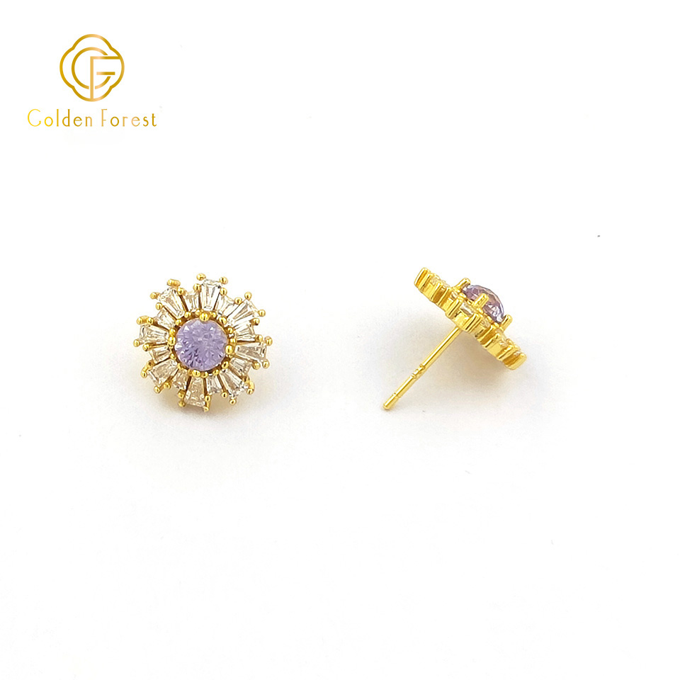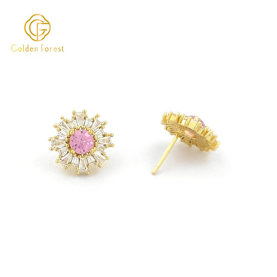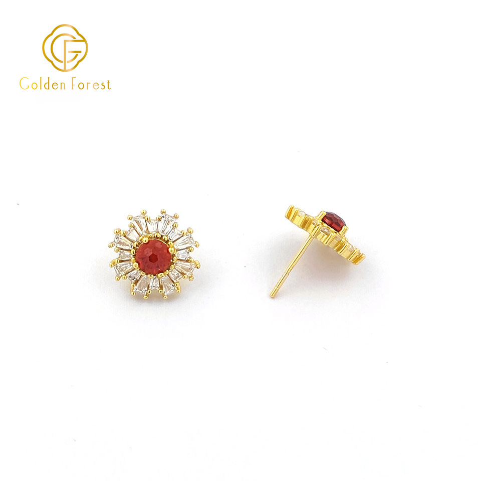 Each piece features a sunflower – like design, with a central cubic zirconia (CZ) stone available in red, pink, or purple. Surrounding the central CZ, baguette – cut white CZ stones radiate outwards, mimicking the petals of a sunflower and adding a brilliant sparkle.