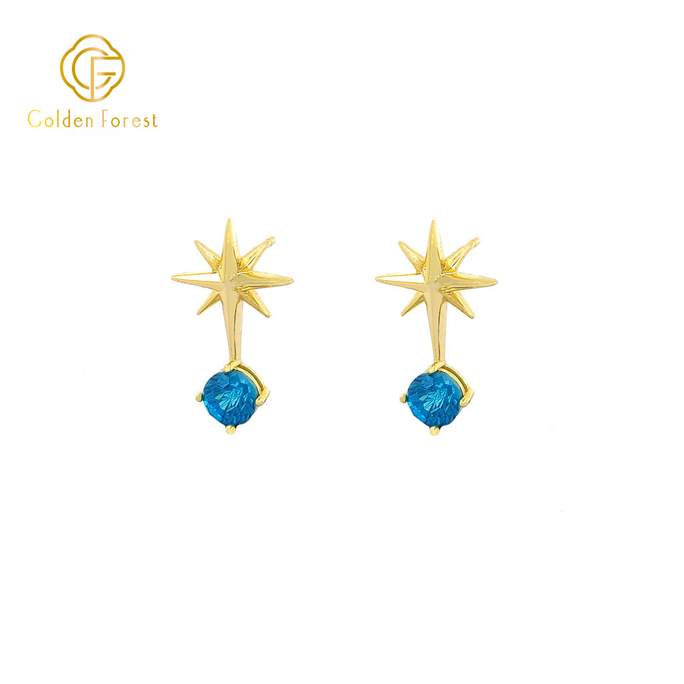 Each piece showcases a striking star design. Dangling from the star elements are round cubic zirconia (CZ) stones, available in a beautiful array of colors: red, pink, purple, and blue.