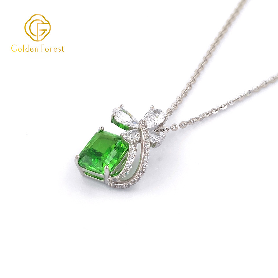 The pendant features a large, emerald – cut green cubic zirconia (CZ) stone, adorned with a bow – shaped design that includes marquise – cut and round – cut white CZ stones.