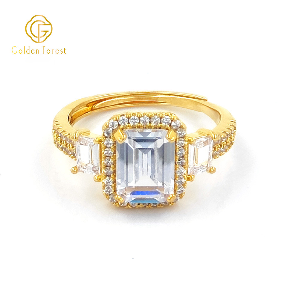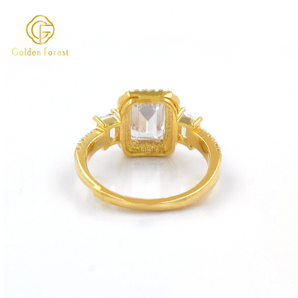 This exquisite ring is crafted from 925 sterling silver and features 14K gold – plating. At its center, a large, radiant emerald – cut cubic zirconia (CZ) stone steals the show, boasting remarkable clarity and sparkle. Surrounding the central CZ, a halo of smaller round – cut CZ stones enhances its brilliance. Additionally, there are baguette – cut CZ stones positioned on either side of the central gem, adding an extra touch of elegance. The band, also adorned with tiny CZ stones, ensures a continuous dazzling effect. Ideal for special occasions or to elevate your everyday style, this ring combines timeless design with eye – catching glamour.