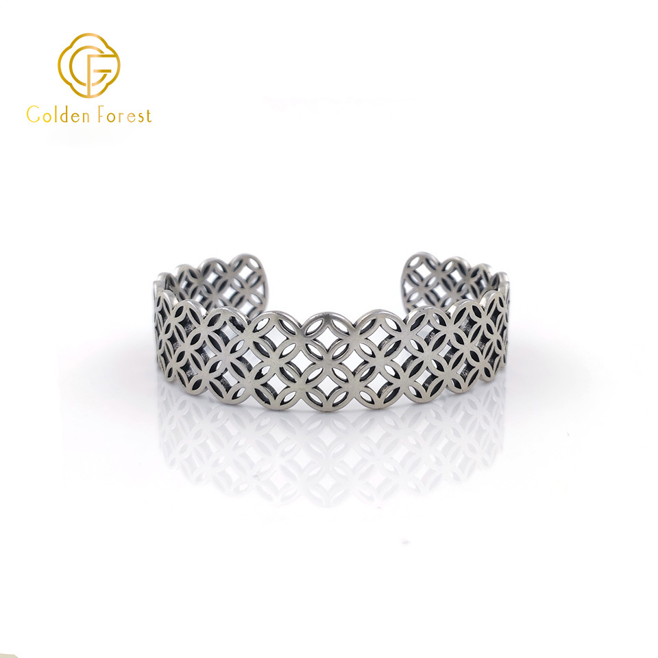 Tailored for women, this bracelet features intricate geometric patterns on a silver open – cuff design.