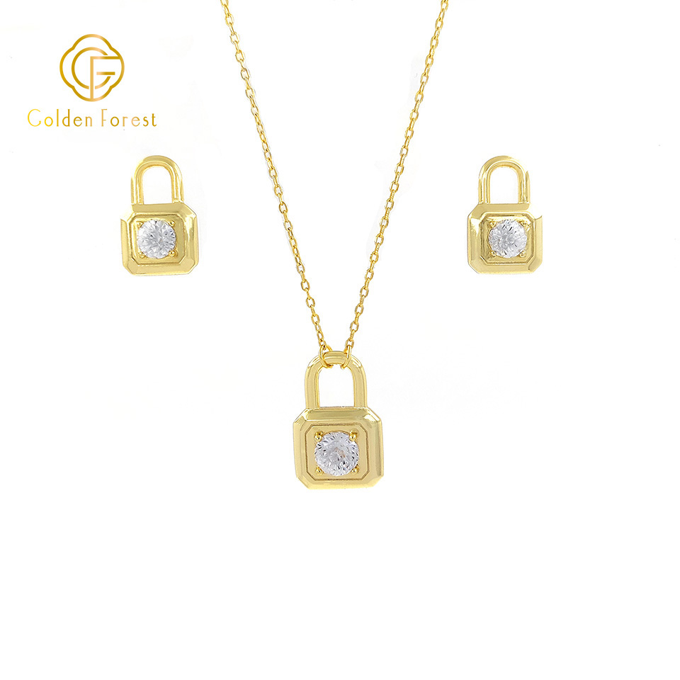 This elegant jewelry set, crafted from 925 sterling silver and luxuriously plated in gold, includes a necklace and a pair of stud earrings.