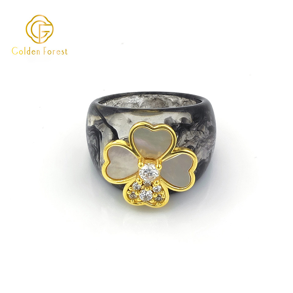This distinctive ring combines 925 sterling silver, gold – plating, and a resin band.