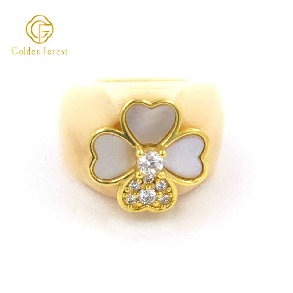 The top features a clover design with mother – of – pearl inlays and sparkling cubic zirconia stones.