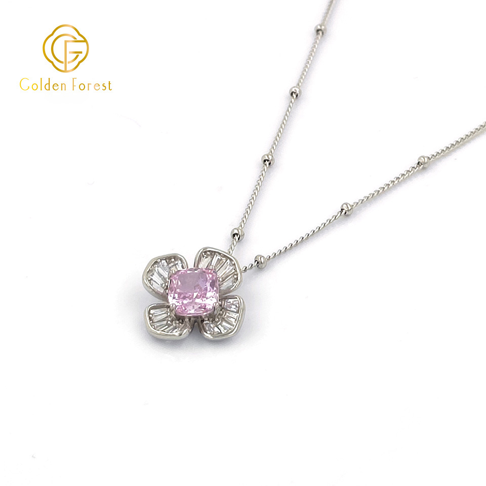 The pendant features a clover design, with a central pink cubic zirconia (CZ) stone surrounded by baguette – cut white CZ stones.