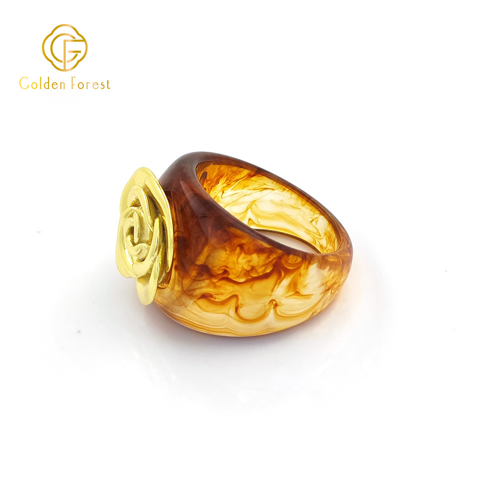 The resin ring showcases a warm, marbled pattern, creating a stylish contrast. Perfect for those seeking a distinctive accessory to complement their fashion sense.